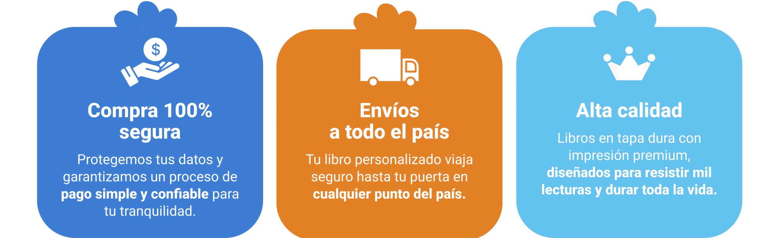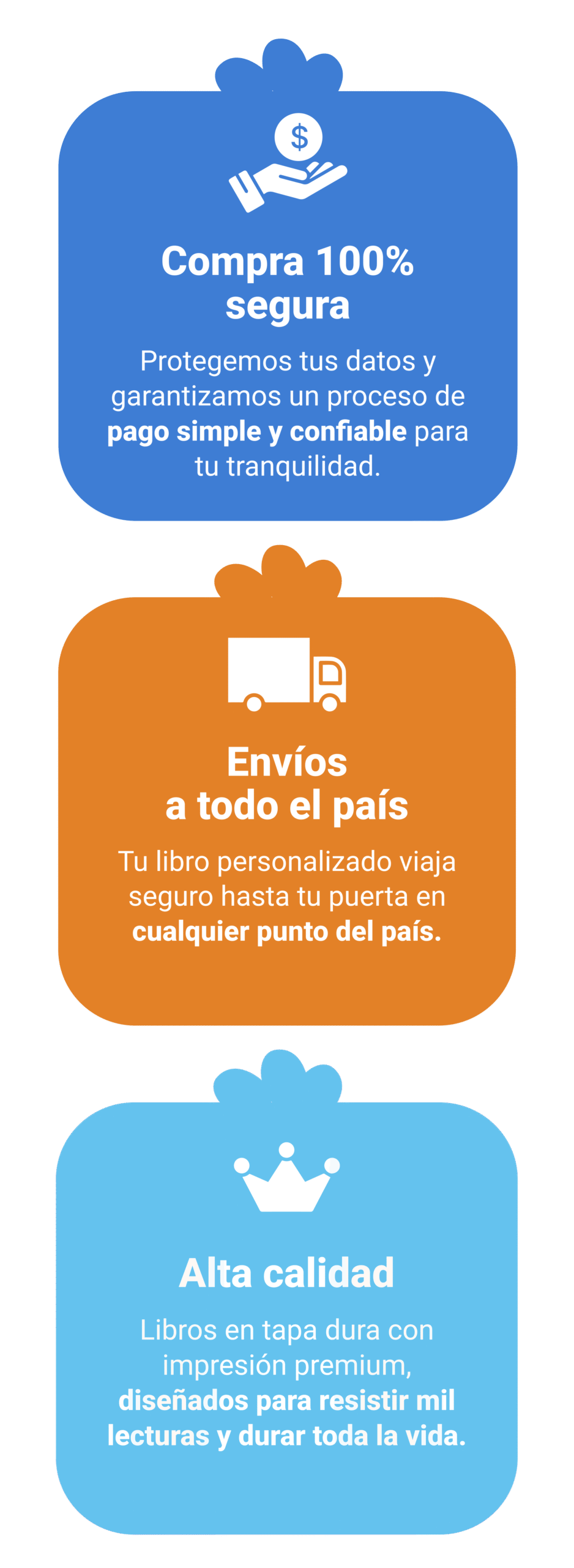 Al ser un producto personalizado y único, no realizamos cambios ni devoluciones. Por esa razón, nuestro formulario pide el mayor detalle posible para que el resultado sea increíble. Sin embargo, si el libro presenta algún defecto de fabricación o falla técnica, nos hacemos responsables y realizamos el cambio correspondiente.